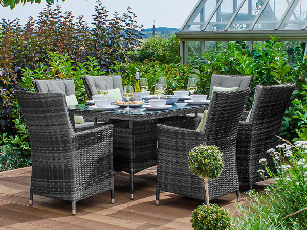 Sienna 6 seater rectangular rattan furniture set 1 6m the sienna 6 seater rectangular furniture set is ideal for fine dining al fresco.